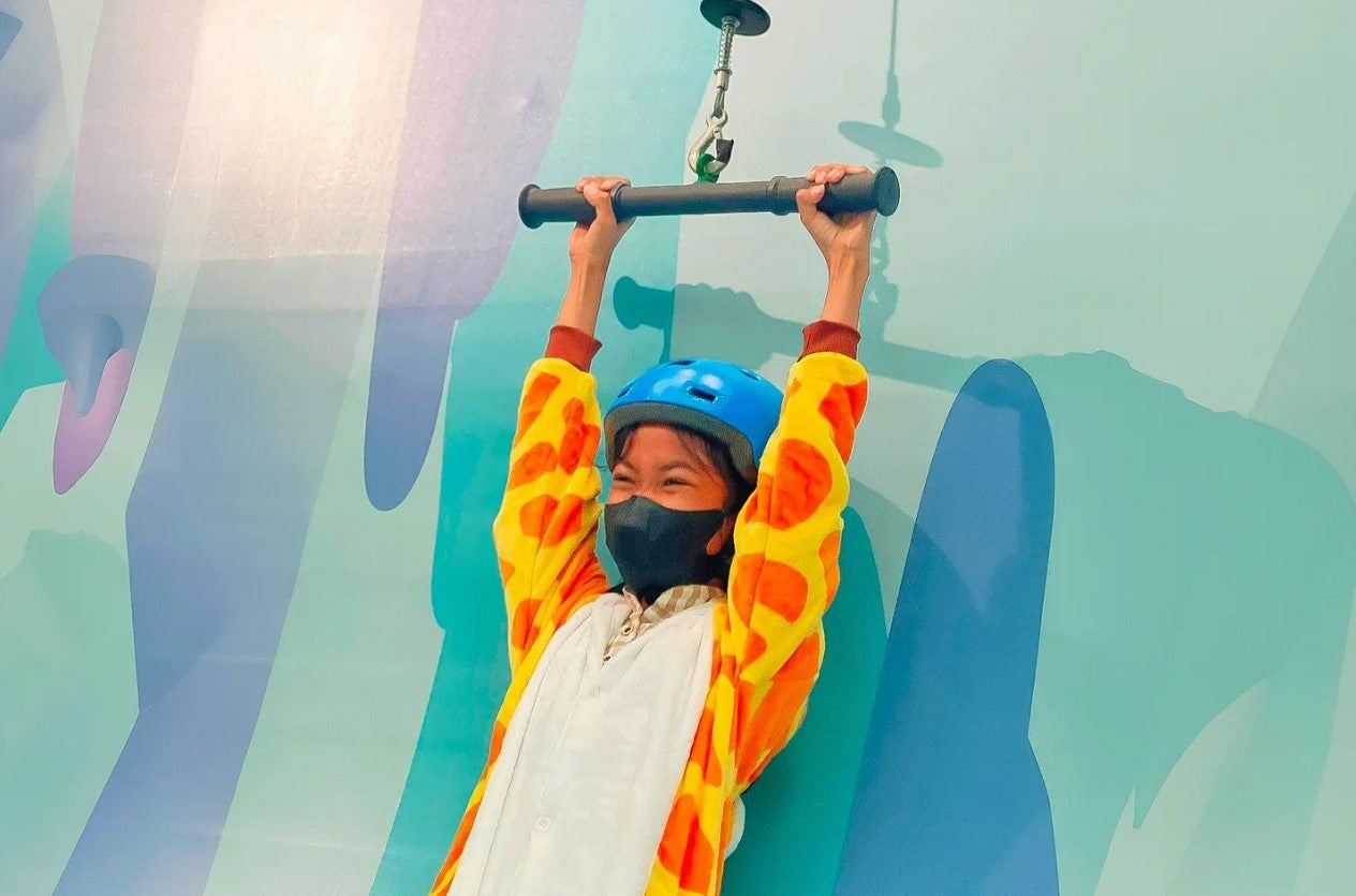高さ約5mからほぼ垂直に滑り降りる、スリル満点のアスレチック「バーティカルスライダー」。動物柄のスーツとヘルメットを身に着け、ハンドルをしっかり握ったら準備完了!最高点まで引き上げられるドキドキ感のあと、一気に滑り降りる爽快感を体験できます。