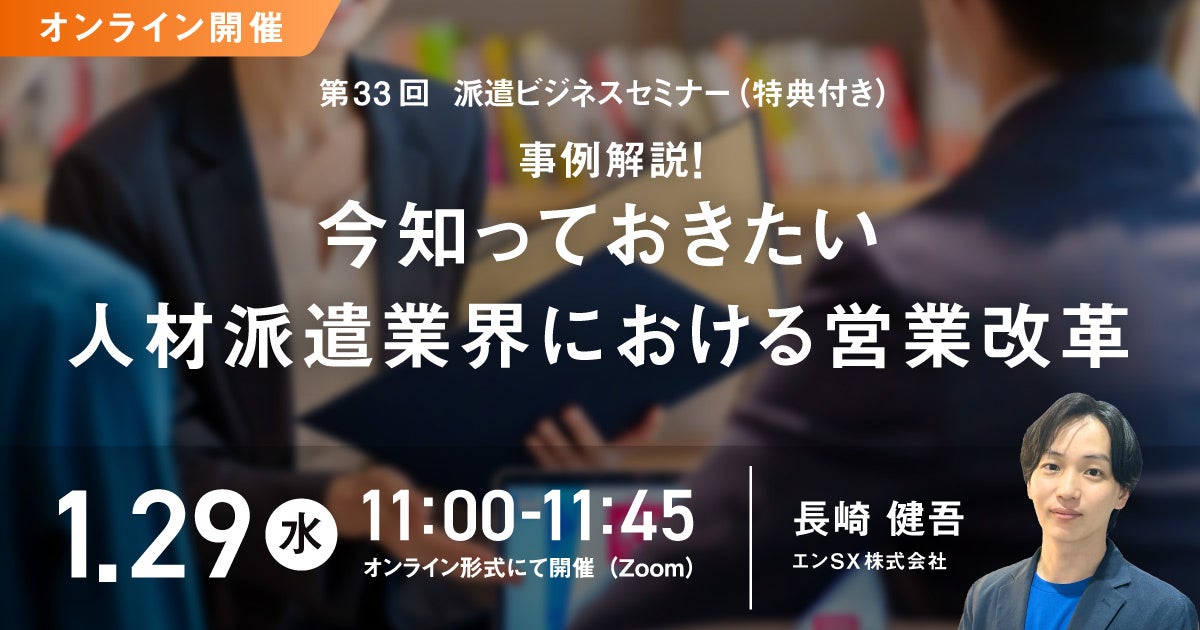 エン・ジャパン株式会社(本社:東京都新宿区、代表取締役社長:鈴木孝二)は、2025年1月29日(水)に派遣会社向け「派遣ビジネスセミナー」をオンライン開催いたします。今回のテーマは「人材派遣業界における営業改革」。当社子会社 エンSX株式会社 営業責任者・長崎 健吾が登壇し、派遣会社の営業改革を事例とともに解説いたします。ぜひご参加ください。