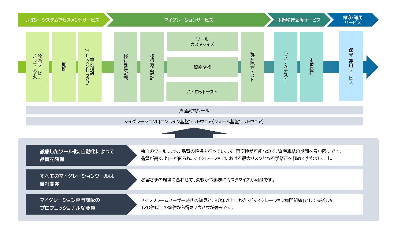 プロジェクト終盤まで変換ツールを継続的に成長させることで100%に近い機械変換をめざし、システムの凍結期間を極小化します。また、マイグレーションのエキスパートによるスキルトランスファーやシステムテスト/移行のサポートも実施し、安心/安全/確実な本番環境への移行を実現します。