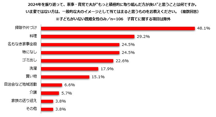 「2024年を振り返って、家事・育児で夫が“積極的に取り組んでいた”と思うことは何ですか」との質問には、お子さんがいる・いないに関わらず「ゴミ出し」と答えた人が最も多くなりました。また、もっと積極的に取り組んだ方が良いと思うことについては、お子さんがいる人もいない人も「掃除や片づけ」が最も多くなりました。2023年の調査(※)では、お子さんがいる人の回答で最も多かったのは「名もなき家事」でしたが、今回は比率を下げて2位となっています。家事育児で夫が積極的に「もっと取り組んだ方が良いこと」の比率から「取り組んだこと」の比率を引いて算出した「取り組み不足度」はお子さんがいる人もいない人も「名もなき家事」がトップではありますが、ギャップも少なくなる傾向にあります。まだ家事育児の負担は妻に大きくのしかかっている傾向は見られるものの、夫の頑張りで偏りを解消する方向へと進んでいる様子が見られます。一方で、仕事の負担は減っておらず、職場には家庭との両立が女性だけの課題ではなくなりつつあることを踏まえた体制づくりが求められると考えます。