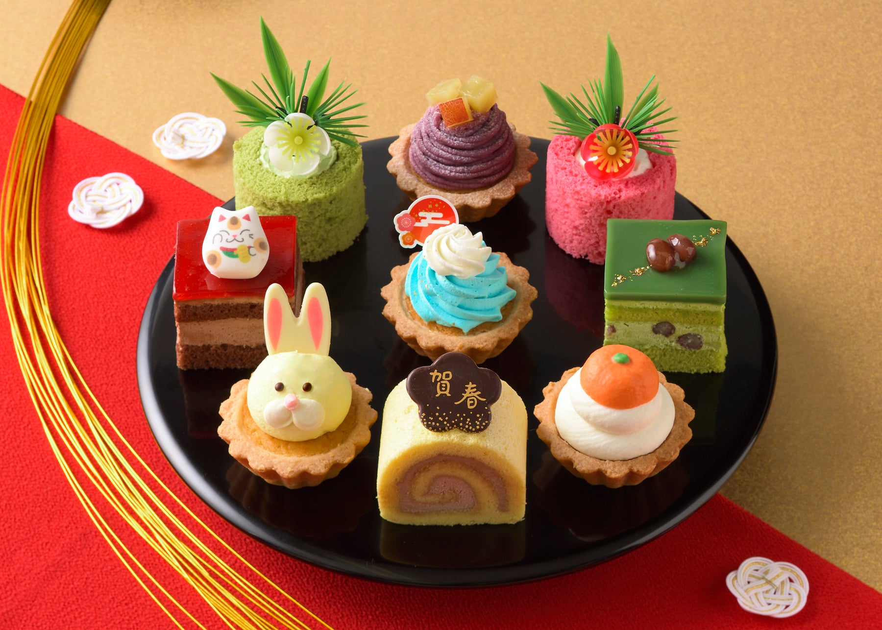 2023年の「スイーツ初め®」にぴったり!干支のうさぎや初日の出をモチーフにしたタルト、招き猫の飾りをのせたラズベリーのケーキなど、9種のプチケーキをおせちのお重をイメージしたボックスに詰め合わせました。