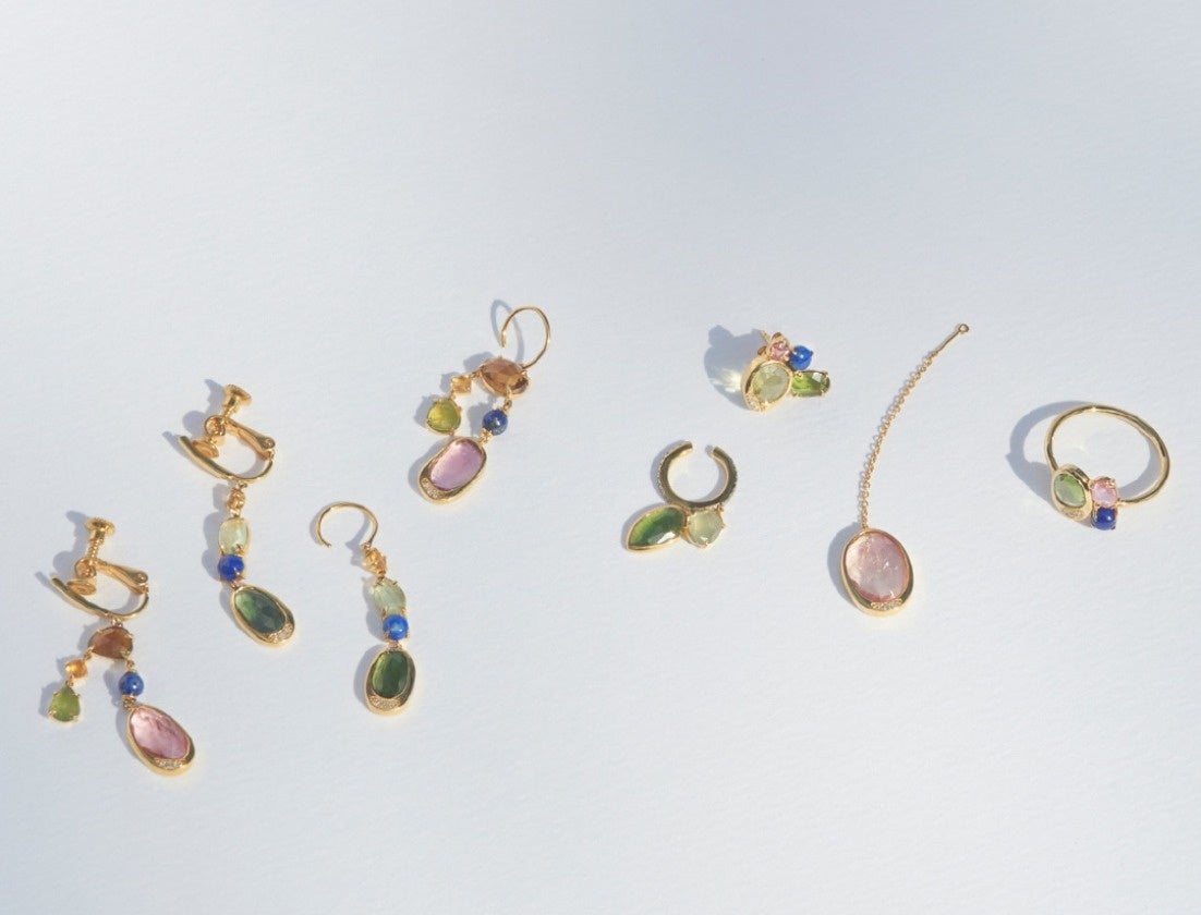 ブランドで1番の人気を博す “elafonisi”シリーズより、幻想的なピンクと透き通るエメラルドグリーンが織りなす、バイカラートルマリンのリングとピアス。色とりどりのマルチトルマリンを基調とした、一点もののジュエリーがラインナップ。そして“raw beauty”シリーズからは、大ぶりのクリアクォーツとレインボームーンストーンをあしらったジュエリーが登場します。