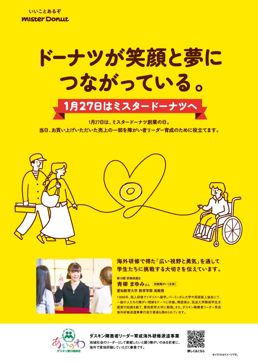 1月27日にミスタードーナツ店舗でお買い上げいただいた売上の一部を障がいのある方の自立と社会参加を支援する「公益財団法人 ダスキン愛の輪基金」に寄付させていただきます。当日はショップでドーナツをお楽しみいただき、社会貢献活動への参加をしてみませんか。