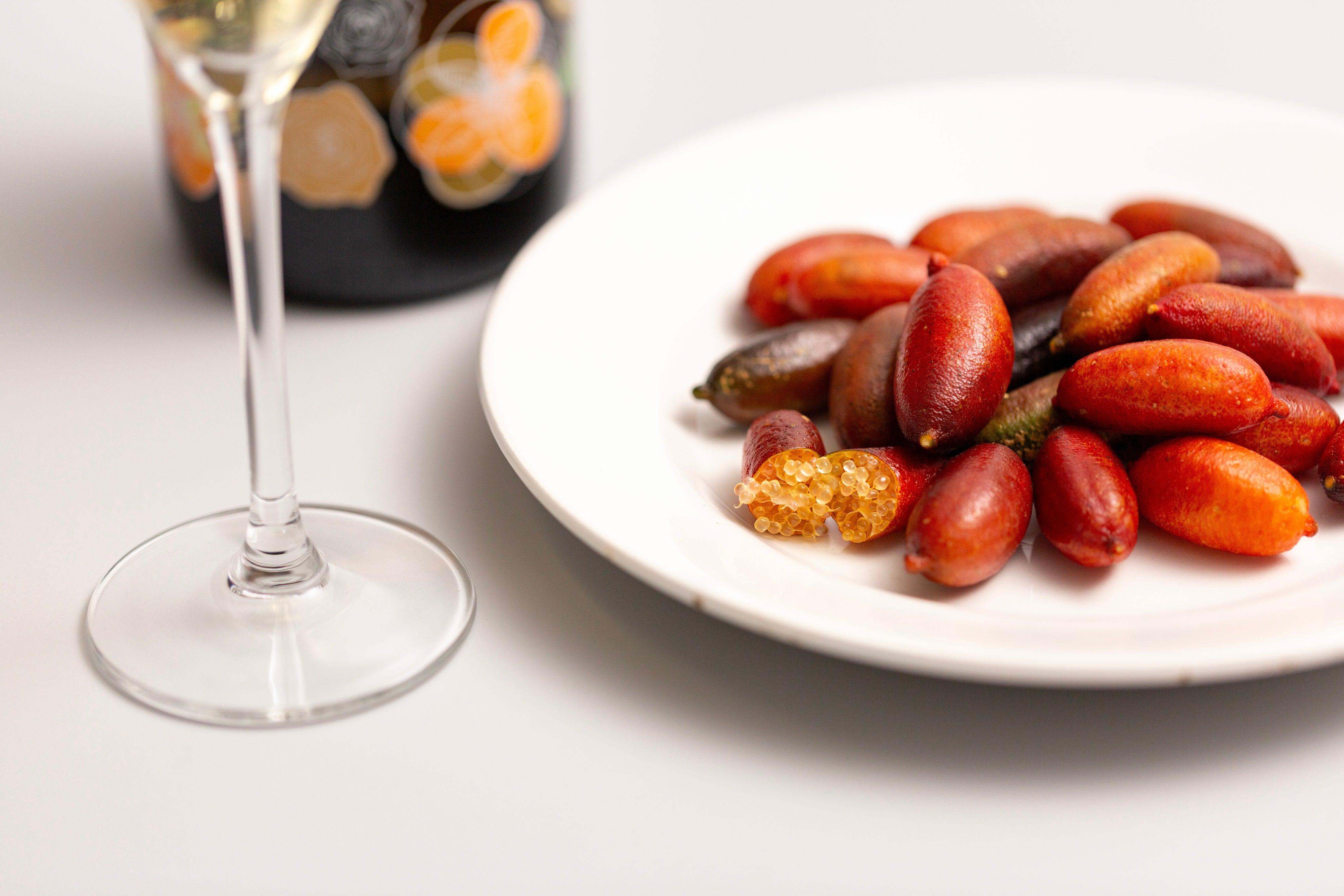 フィンガーライムは別名「フルーツキャビア」とも呼ばれる柑橘の一種。半分に切ってチューブのように押し出すと、中から驚くほどたくさんのキラキラした小さな粒がこぼれだします。半分に切って取り出した粒々は、山椒のようなスパイシーさや爽やかさを感じる香りと酸味がはじけ、まるでキャビアのようなプッチプチの食感です。