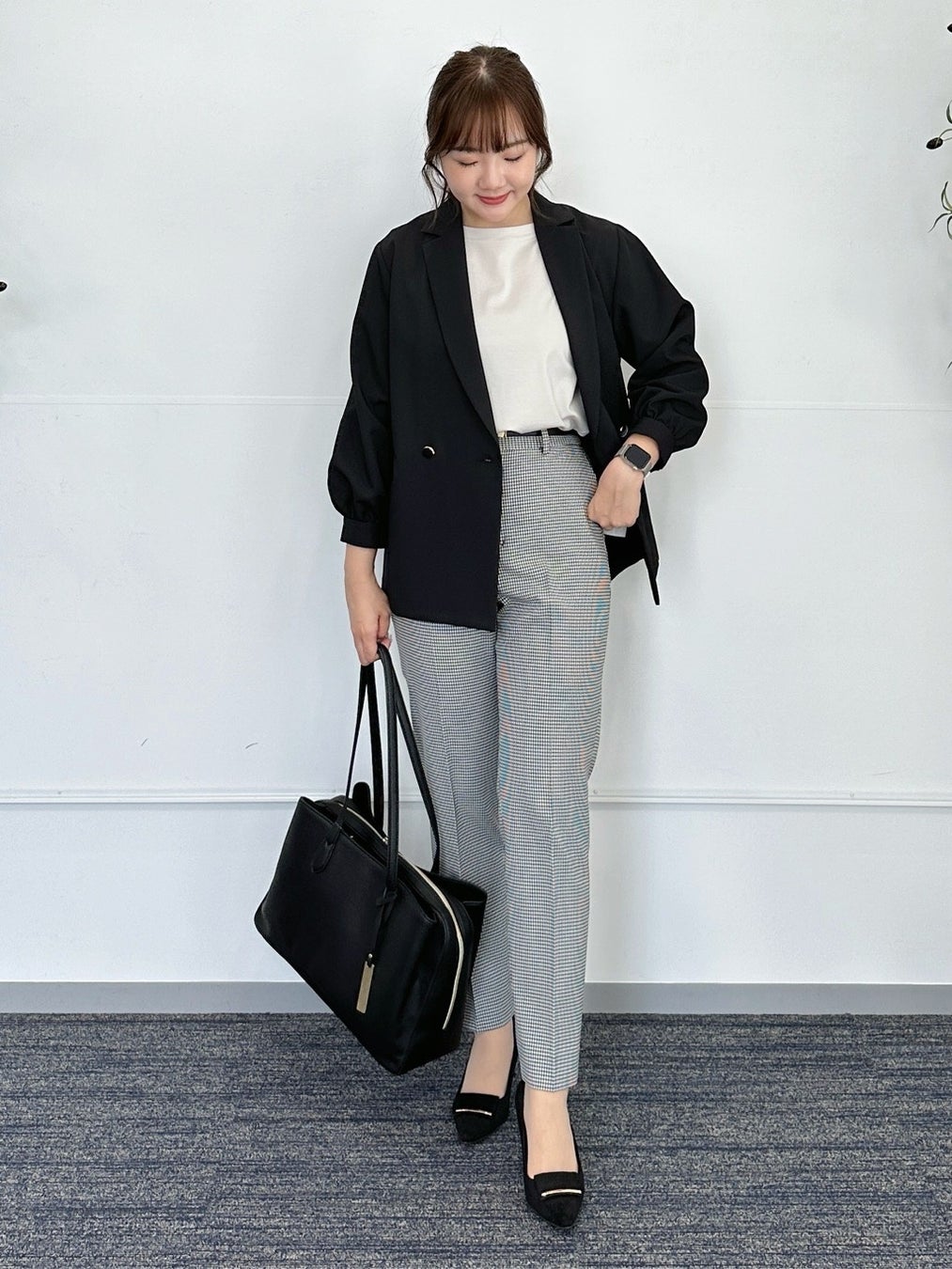 定番の黒のセットアップも、ジャケットをトレンドのショート丈にすることで、新鮮な印象を演出します。スカートとの相性も抜群です。大きなリボンタイが魅力的なブラウスで華やかさをプラス。ショート丈とリボンで視線が上がり、脚長効果も期待できます。