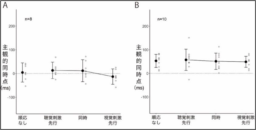 注1)時間的再較正:視覚や聴覚などの知覚様相間で刺激のタイミングに一定の時間差が数分間程度にわたって持続した場合、その時間差を補償して(0に近づけて)知覚的に同時に感じやすくなる順応的変化のこと。