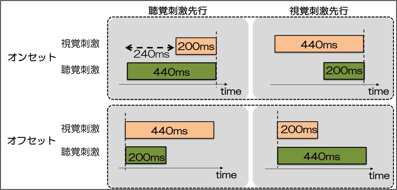 そこで、本研究では、刺激の開始時(オンセット:図1上部)と終了時(オフセット:図1下部)のいずれかに、知覚的に区別しやすい100ms以上の長さの視聴覚刺激を用い、数分間の繰り返し試聴によって視聴覚刺激のタイミングに関する知覚がどのように変動するのかを検討しました。