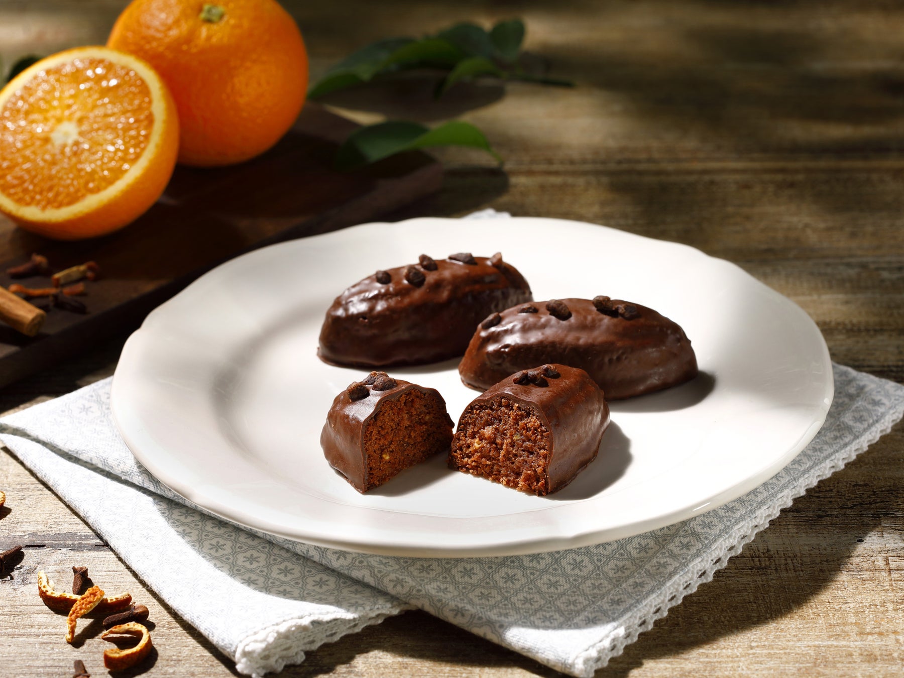 こだわりの2種類のチョコレートを使用した生地に、オレンジピールを練り込み、シナモンなどの香辛料を加えた、甘さ控えめで奥深い味わいのマドレーヌです。生地をチョコレートで覆い、トッピングのチョコレートパールシュガーで食感も愉しめるよう仕上げました。