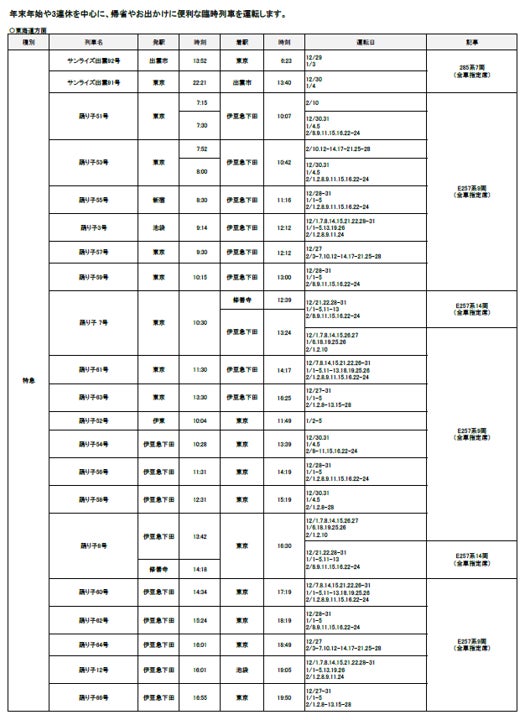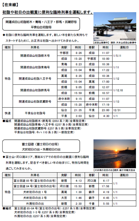 2024年12月1日(日)~2025年2月28日(金)の期間に、年末年始の帰省や冬のイベントへのお出かけ、初日の出観賞に便利な列車を運転します。また、大晦日から元旦にかけて、首都圏の7路線で終夜運転を実施します。 |