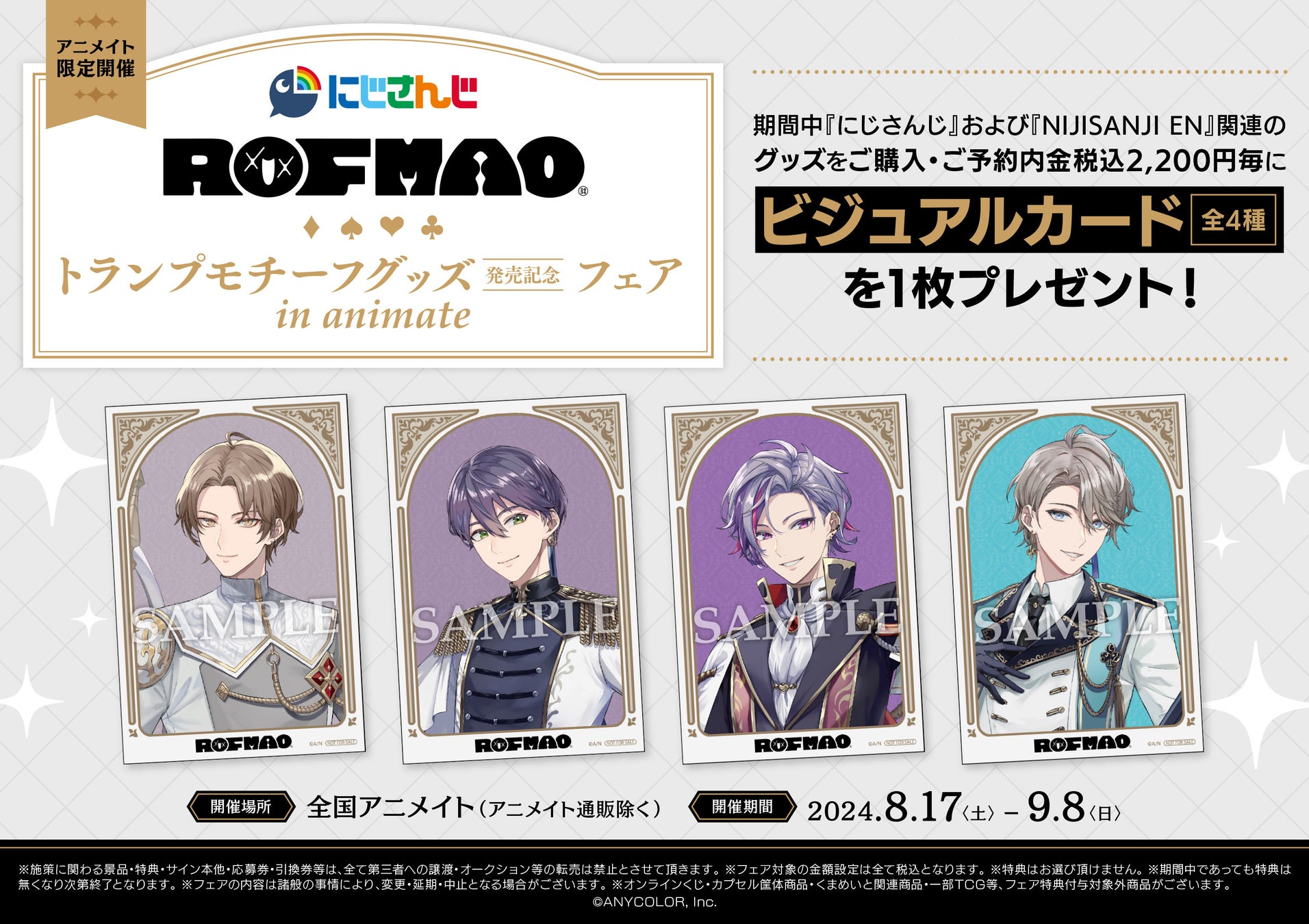 全国のアニメイトにて「にじさんじ ROF-MAO トランプモチーフグッズ発売記念 フェア in animate」を開催!期間中、「にじさんじ」「NIJISANJI EN」関連グッズをご購入・ご予約内金2,200円(税込)ごとに、特典「ビジュアルカード(全4種)」を1枚プレゼントいたします。