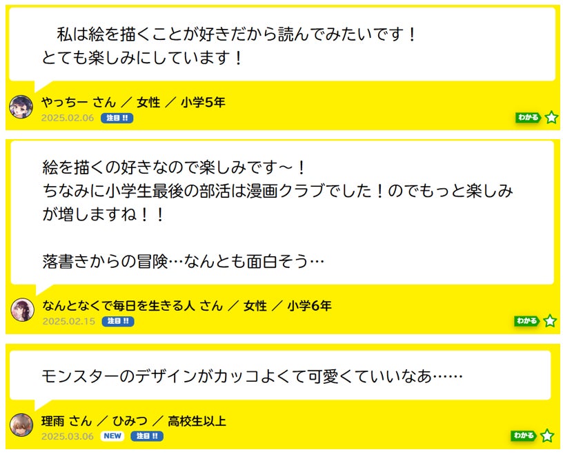 ギャグシーンやバトルシーンなどテンポ感あふれる展開の数々で、絵を描くことやモンスターが好きなお子さんはもちろん、普段あまり本を読まないお子さんも楽しめる内容となっております。