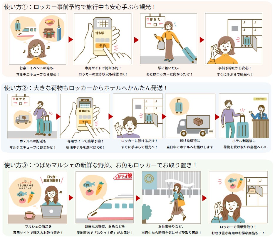 JR 九州とJR 東日本スマートロジスティクスでは、今後もさらなる駅の利便性強化、手ぶら観光の推進、新幹線荷物輸送サービス「はやっ!便」との連携など、新たな顧客体験の創出を目指し、今後も九州内での「マルチエキューブ」の設置拡大や新たなサービスの構築を目指してまいります。
