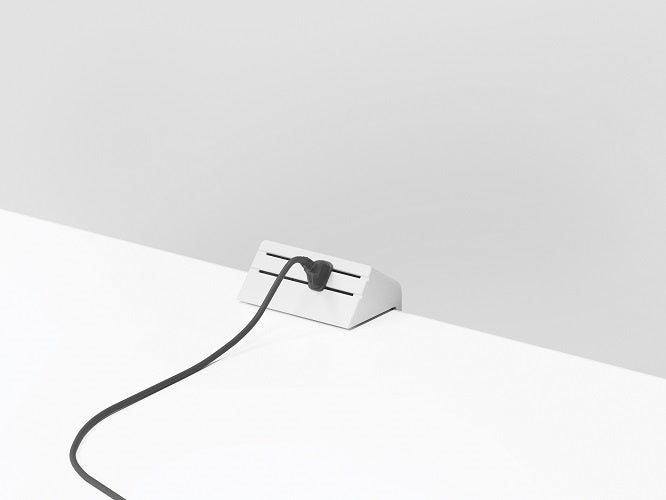 ライン形状の差込口で、シンプルなデザインの電源コンセントです。テーブルの端面に取り付けてもすっきりとした見た目になるよう、背面の配線が見えない形状に仕上げました。クランプ式のため、利用者や利用環境に合わせてさまざまなテーブルのアクセスしやすい位置に固定できます。