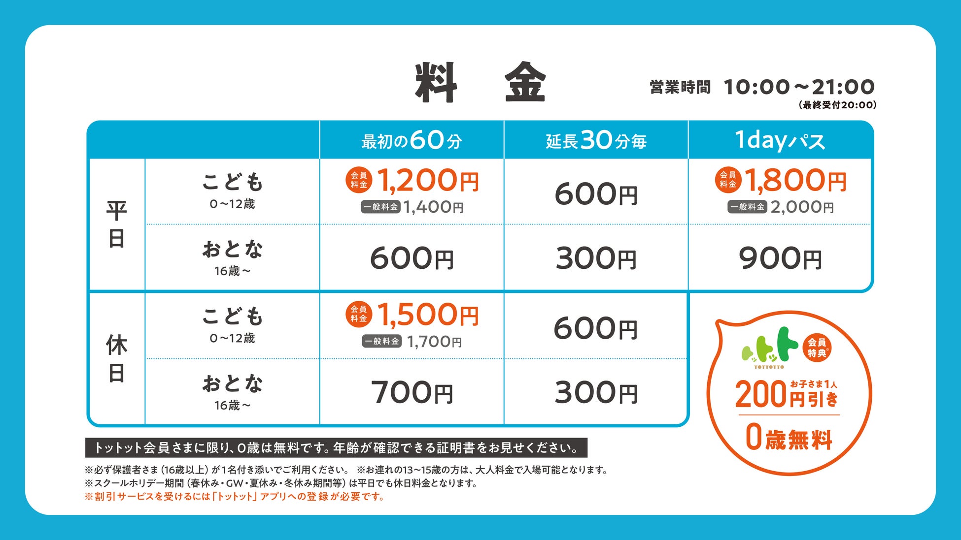 ・上記料金は、子育て応援アプリ「トットット」に会員登録された方の会員価格です。入場当日にご登録いただいた場合も、当日から会員料金が適応されます。