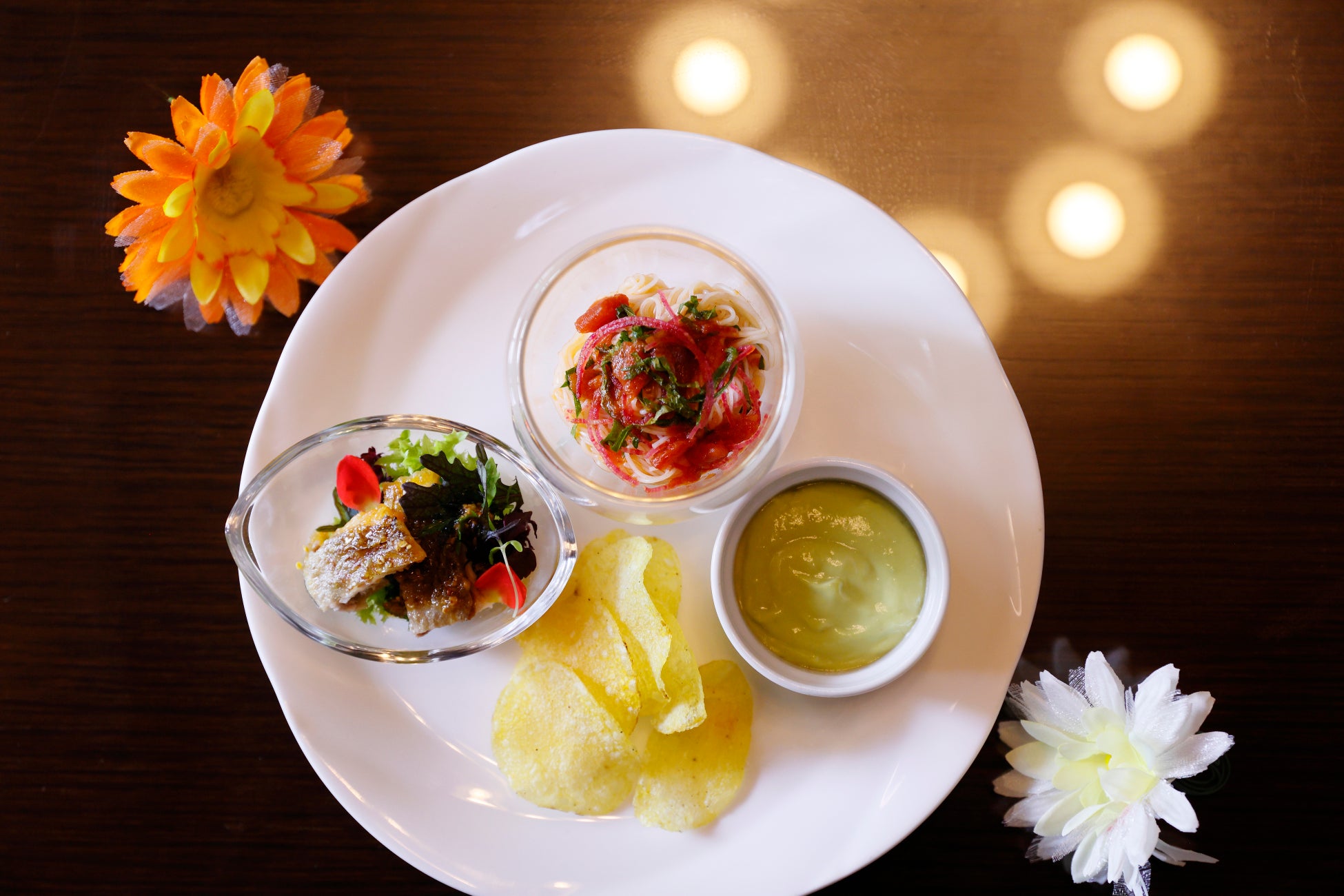 今回のハイティーは、思い出に残るような夏のひとときをお過ごしいただきたいという思いから、爽やかな料理とバーテンダーオリジナルカクテルを含むドリンクのフリーフローをご用意いたしました。 夕食にも最適なセイボリーは、奈良県桜井市の特産品「三輪そうめん」をトマトとレモンの爽やかな酸味が特徴のソースで和えた「トマトとレモン香る冷製パスタ風そうめん」やスパイスがアクセントとなる「ココナッツ香るタンドリーチキンライム添え」など、夏場の食欲を誘う逸品の数々をご提供いたします。