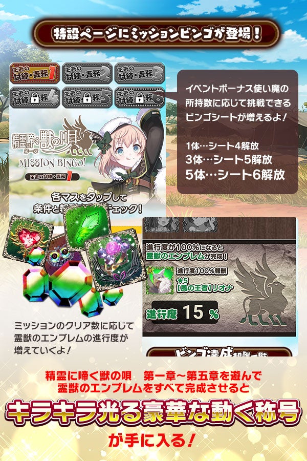 また、対象ミッションの達成数に応じて霊獣のエンブレムの進行度が増えていき、100%になると「【風の王者】リオナ」が手に入ります。
