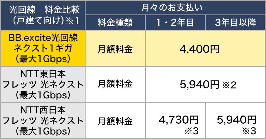 ※1 以下3サービス・プランの料金比較となります。比較対象は、「BB.excite光回線 ネクスト1ギガ」、NTT東日本「フレッツ 光ネクスト ファミリー・ギガラインタイプ」、NTT西日本「フレッツ 光ネクスト スーパー・ハイスピードタイプ隼」です。(2024年11月当社調べ)