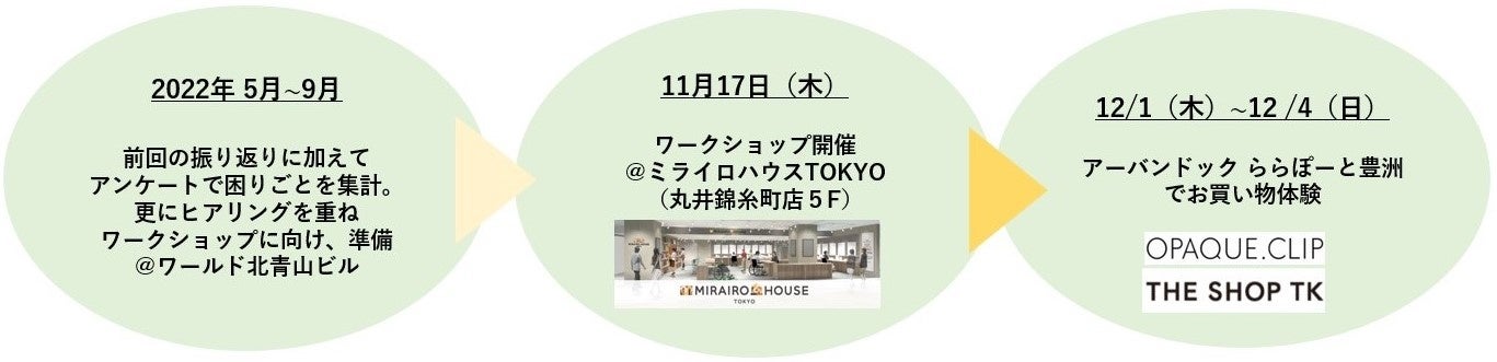 この取り組みは「特別なことではないパーソナルサービス」「支援ではなく共創」「見える人、見えない人のお互いの世界を知る」を目的に、アンケートやワークショップを通して視覚に障がいのある人の困りごとを捉え、12 月1日(木)から12月4日(日)までアーバンドック ららぽーと豊洲のワールドグループの店舗で13名が買い物の実体験に参加しました。