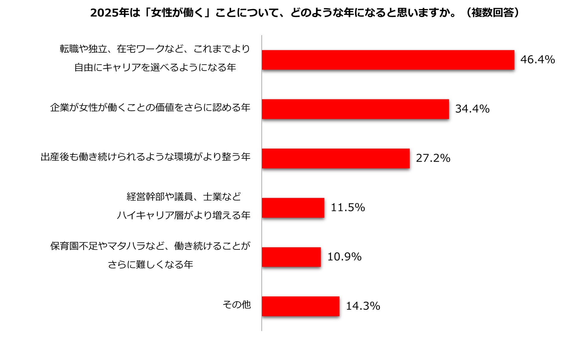 女性にとって2024年とはどんな年だったのか。主婦層を中心とする就労志向の女性に「2024年を振り返って、2023年より「女性が働きやすくなった」実感はありますか」と尋ねたところ「ない」が6割を超えていたものの、「ある」と回答した人の比率は3年連続で上昇しました。その理由として最も多かったのは「働く女性の数が増えてきた」でした。また2024年がどんな年で2025年はどんな年になるかについては、いずれも「転職や独立、在宅ワークなど、これまでより自由にキャリアを選べる」と回答した人が最も多くなりました。