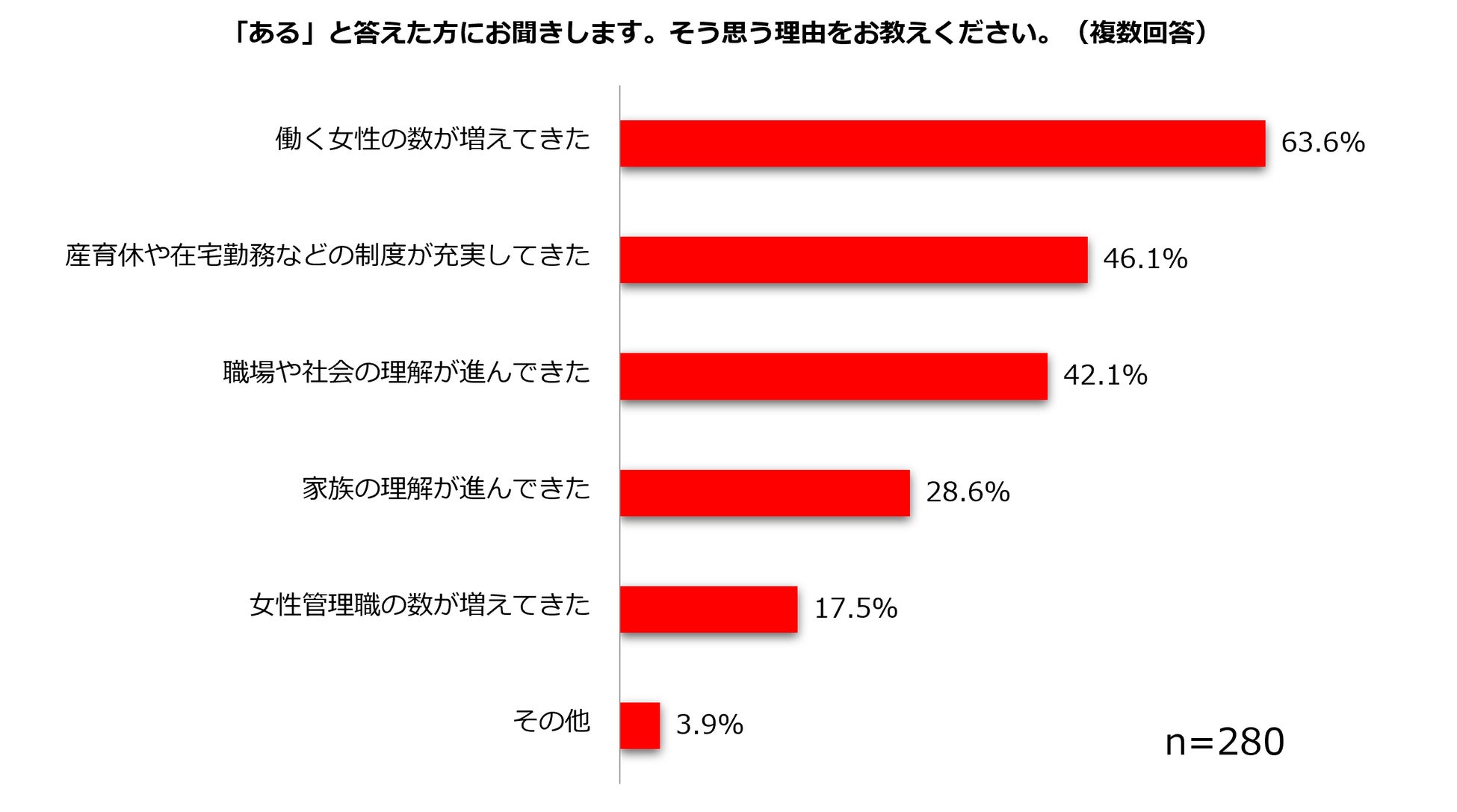 2.働きやすくなった実感の理由「働く女性の数が増えてきた」63.6%