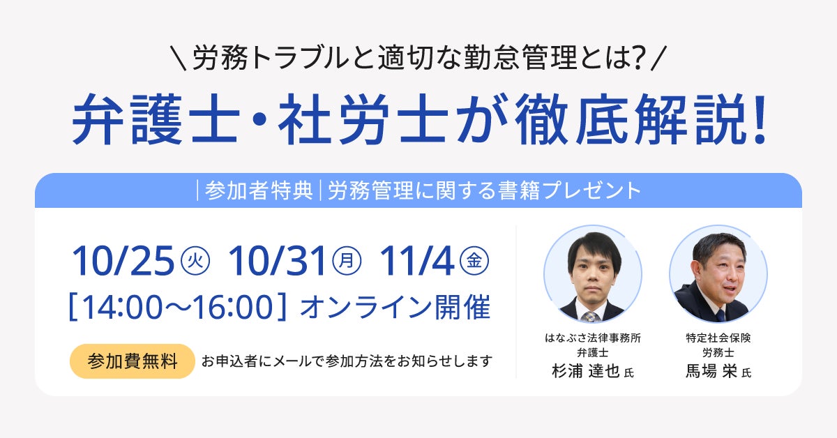 freee株式会社(本社:東京都品川区、CEO:佐々木大輔、以下「freee」)が提供する「freee勤怠管理Plus」では、2022年10月25日(火)・31日(月)・11月4日(金)の3日間、「弁護士・社労士が徹底解説!労務トラブルと適切な勤怠管理セミナー」を開催します。はなぶさ法律事務所 弁護士 杉浦 達也 氏と社会保険労務士法人ヒューマンリソースマネージメント 特定社会保険労務士 馬場 栄氏を迎え、労務トラブルと適切な勤怠管理についてお話します。セミナー参加後のアンケート回答者には書籍『社長、その労務管理はダメです』をプレゼントします。