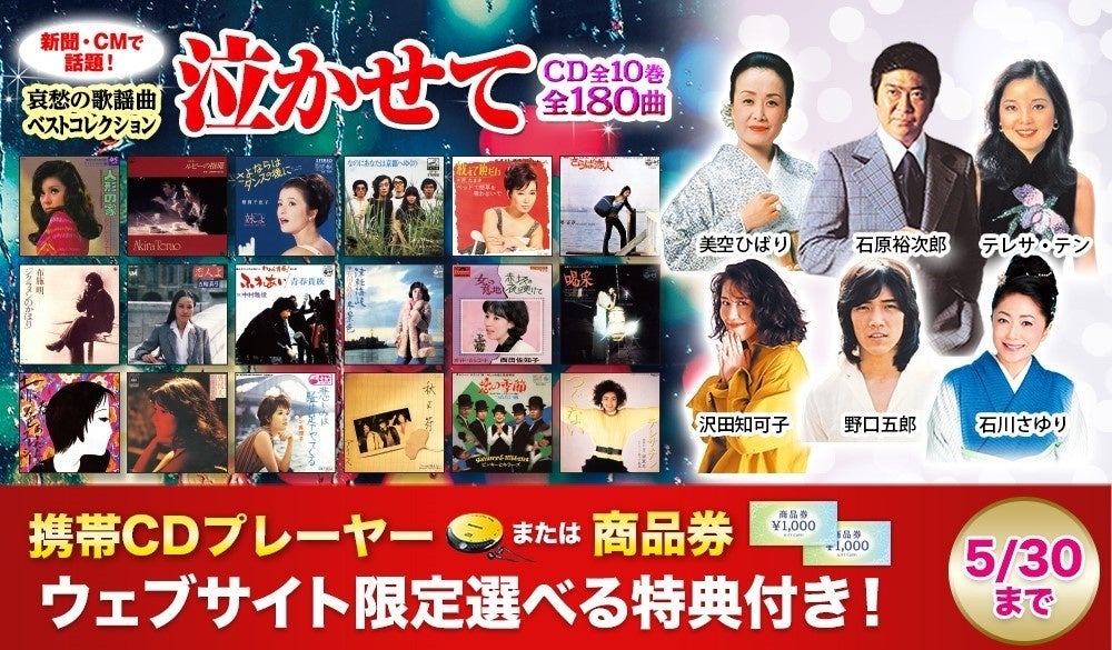 CM・新聞で話題の“泣ける”CD全集『哀愁の歌謡曲 泣かせて』。ウェブ限定・選べるプレゼント付きキャンペーンを開始!【5/30(月)まで】