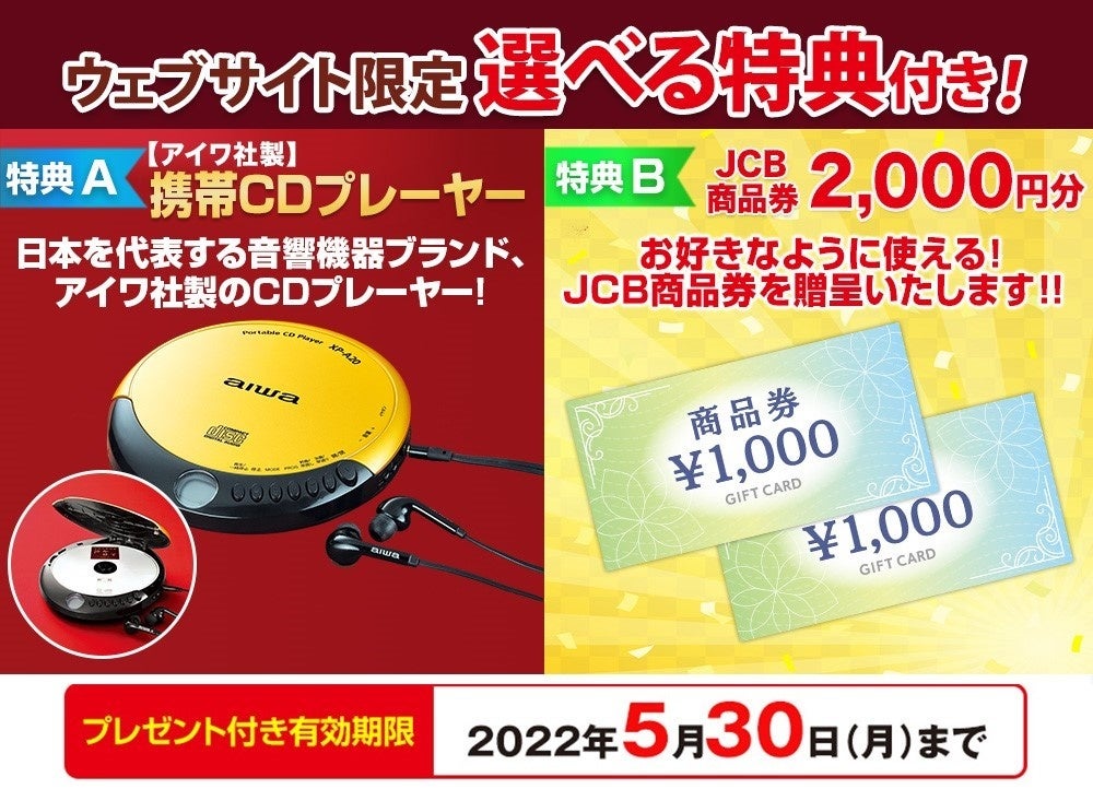 なおウェブサイト限定キャンペーンとして、5月30日(月)までにお申込みいただくと、ご購入記念プレゼントとして、「アイワ社製・携帯CDプレーヤー」または「商品券2,000円分」のいずれか一つをお選びいただけます。