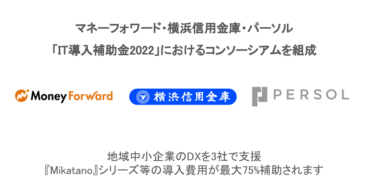 株式会社マネーフォワードは、横浜信用金庫およびパーソルホールディングス株式会社と、経済産業省が主導する「IT導入補助金2022」におけるコンソーシアムを組成しました。信用金庫とのコンソーシアム組成は、当社として初めての事例です。このコンソーシアムはIT導入支援事業者として採択されており、マネーフォワードが横浜信用金庫と連携してITツール『Mikatano』シリーズ等を顧客企業へ提供し、パーソルが顧客企業の補助金の申請支援や導入サポートを担うことで、各社の強みを活かして神奈川県内の中小企業のDX支援を進めてまいります。