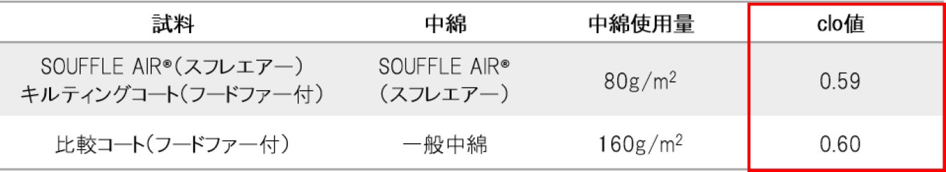 日本女子大学家政学部被服学科衣環境学研究室で「SOUFFLE AIR®(スフレエアー)キルティングコート(フードファー付)」と比較コートの保温性能(clo値)を測定。中綿にSOUFFLE AIR®(スフレエアー)を使用した「SOUFFLE AIR®(スフレエアー)キルティングコート(フードファー付)」は、一般中綿(比較コート)の半分の使用量で同程度の暖かさとなることが確認されました。