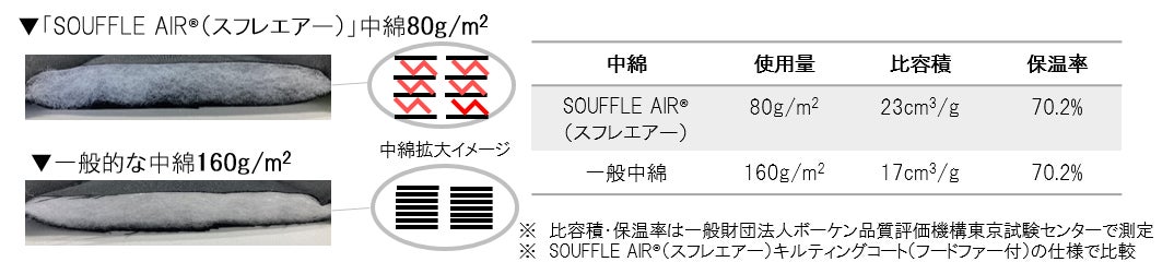 『SOUFFLE AIR®(スフレエアー)キルティングコート(フードファー付)』は、特殊な繊維を使用したかさ高中綿「SOUFFLE AIR®(スフレエアー)」を使用した商品です。この中綿を使用することで一般的な中綿の半分の使用量で保温性を維持することが可能となり、商品の軽量化を実現。また、『SOUFFLE AIR®(スフレエアー)キルティングコート(フードファー付)』の保温性能を日本女子大学家政学部被服学科衣環境学研究室で検証。一般的な中綿の半分の使用量で同程度の暖かさであることが確認されました(実証実験は後述)。