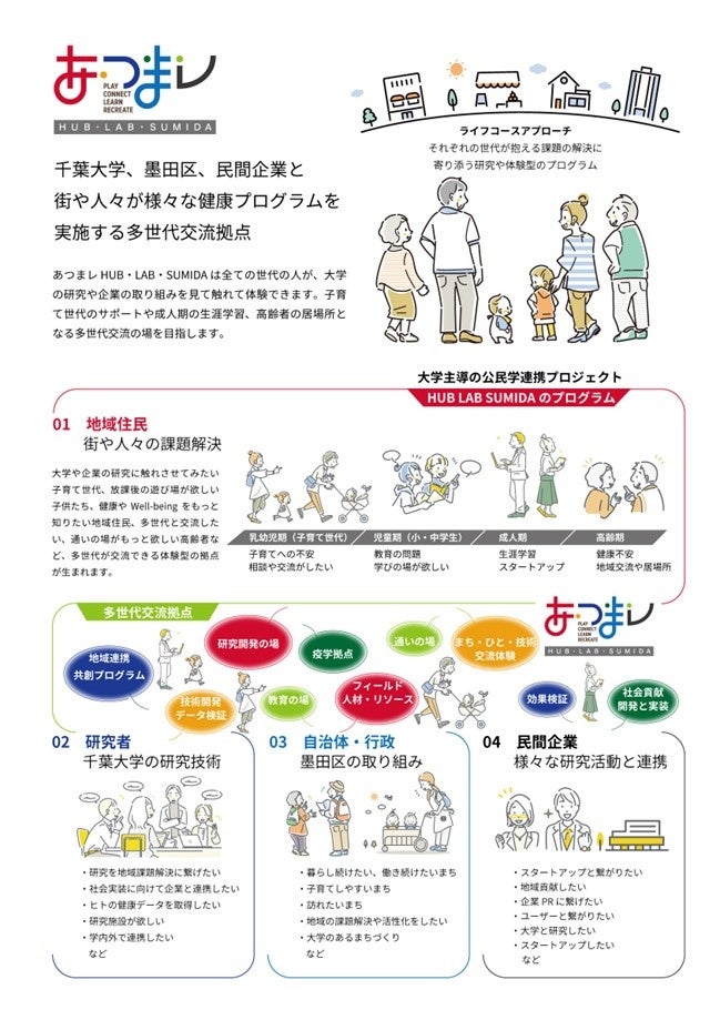 国立大学法人千葉大学は5月23日(金)に、地域課題解決を目指した公民学連携の研究開発拠点「あつまレHUB・LAB・SUMIDA」を墨田サテライトキャンパスに開設しました。あそんで・つながって・まなべるレクリエーション施設の頭文字をとった「あつまレ」は、大学がHUB(ハブ)となり、墨田区・地域住民・民間企業・研究者の連携を強化し、地域の課題解決を目指します。