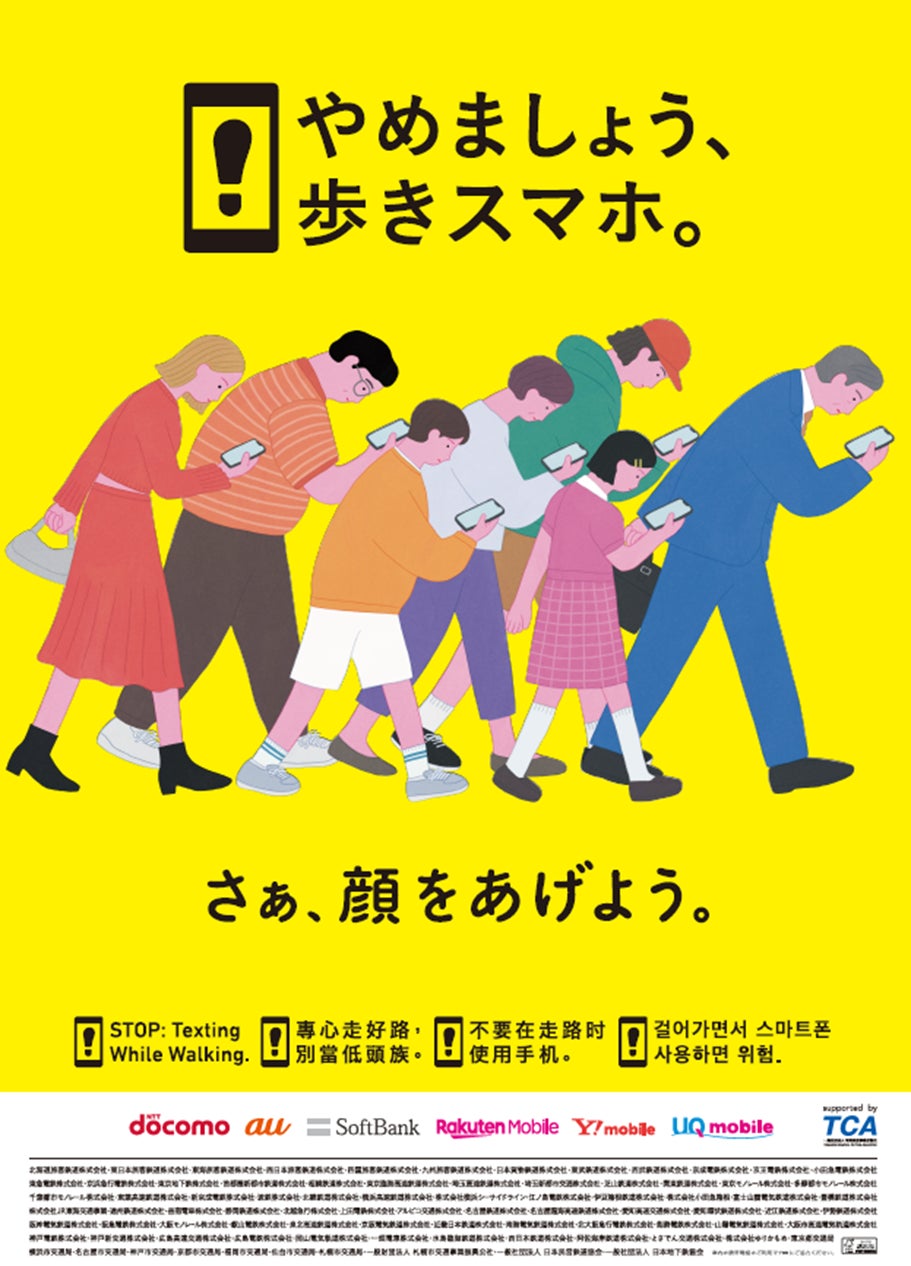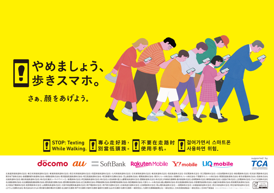 2024年11月1日(金)から全国の鉄道事業者80社局、(一財)札幌市交通事業振興公社、(一社)日本民営鉄道協会、(一社)日本地下鉄協会および(一社)電気通信事業者協会とその加盟社である株式会社NTTドコモ、KDDI株式会社、ソフトバンク株式会社、楽天モバイル株式会社と共同で、「やめましょう、歩きスマホ。」キャンペーンを実施します。駅施設内等における携帯電話・スマートフォンの「ながら歩き」によるお客さま同士の衝突や線路への転落を防止するため、安全なご利用を促進してまいります。