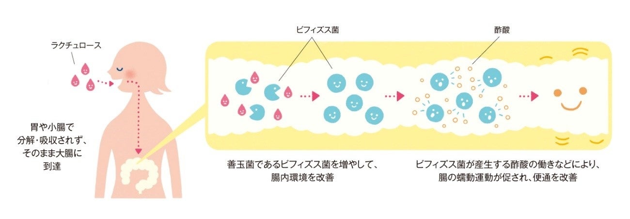 このたび発売する「ミルクオリゴ糖ラクチュロースシロップ」は、ラクチュロースを50%含むオリゴ糖シロップです。機能性関与成分であるラクチュロースには、胃や小腸で分解、吸収されることなくそのまま大腸に届き、腸内環境を改善する(善玉菌の代表であるビフィズス菌を増やしたり割合を高めたりする)機能や、便秘気味の方の便通を改善する機能があることが報告されています。