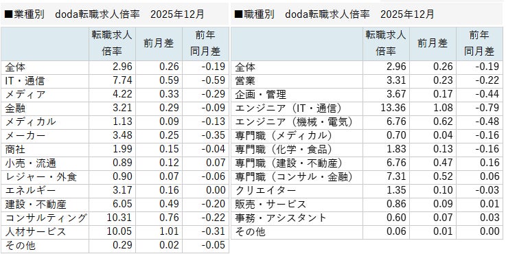 パーソルキャリア株式会社が運営する転職サービス「doda(デューダ)」(編集長:桜井 貴史)は、2025年12月の転職求人倍率をまとめた「doda転職求人倍率」を発表いたします。