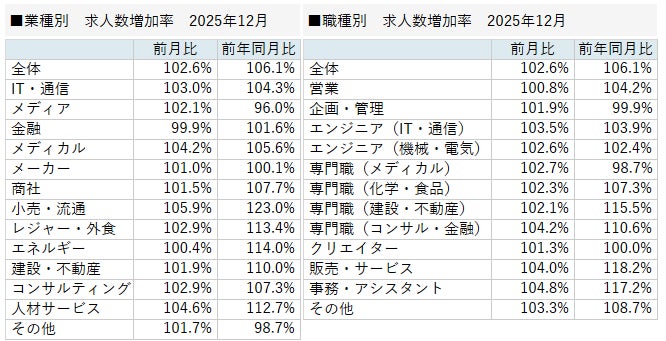 【求人数増加率(業種別・職種別)/2025年12月】