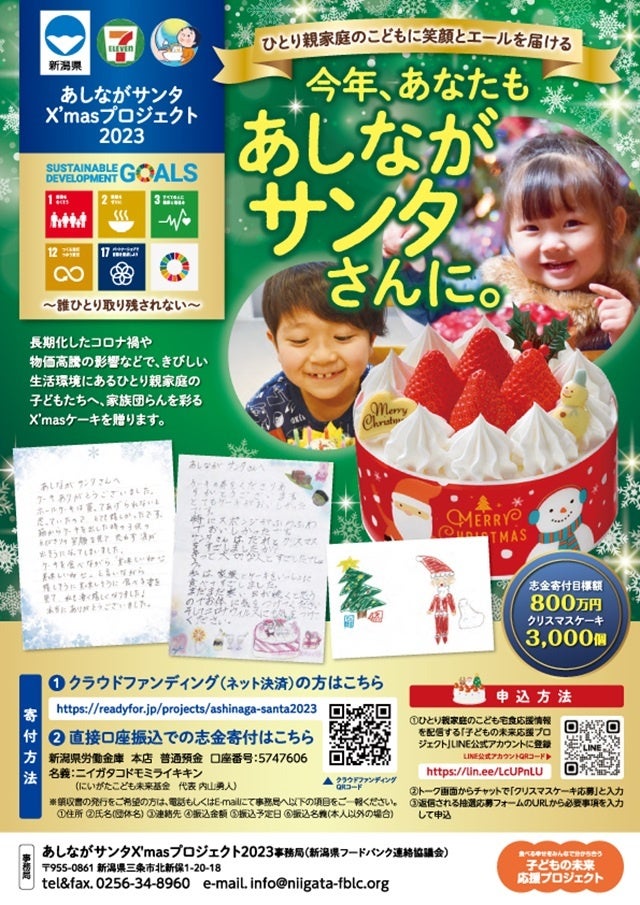 みなさんは、こちらのプロジェクトをご存じでしょうか?新潟県フードバンク連絡協議会、アルビレックス新潟のオフィシャルクラブパートナーである株式会社セブン-イレブン・ジャパン、新潟県が連携したプロジェクトで、長期化したコロナ禍や物価高騰の影響などで、きびしい生活環境にあるひとり親家庭等の子どもたちへクリスマスケーキをお届けするため、クラウドファンディング等で寄付を募っています。