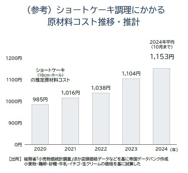 2024年のクリスマスケーキは、昨シーズンに続き原材料価格の高騰による影響を大きく受けた。一般的なショートケーキ(ホール・18cm丸型)にかかる原材料コストについて、店頭価格を基準に帝国データバンクが「ケーキ原価」として算出した結果、2024年平均は1153円だった。23年通年の平均:1104円に比べて4.4%、21年同から13.5%上昇するなど、製造コストが大幅に増加した。