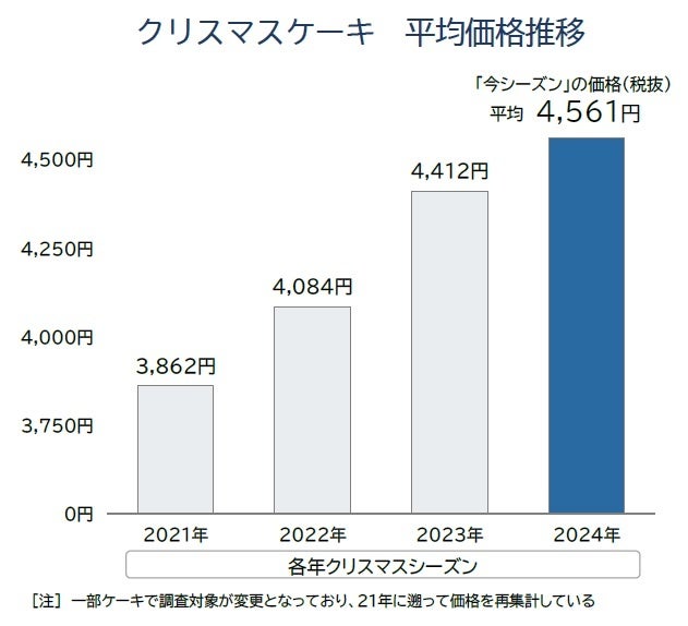 全国の大手コンビニエンスストアや百貨店、スーパー、著名な洋菓子店など計100社で販売されるクリスマスケーキの価格(ホール型5号、4~6人向けサイズ)を調査した結果、2024年冬シーズンの平均価格は4561円(税抜)だった。同じ対象企業のケーキ価格を比較すると、1年前(23年冬、「昨シーズン」)の4412円に比べて149円、率にして3.4%の値上げとなった。