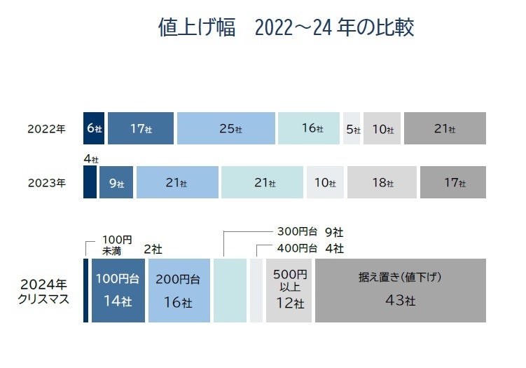 前年から価格が上昇したケーキは57社で、過去3シーズンで最も少なかった。値上げしたケーキでは、値上げ幅が「200円台」以下のケーキが32社を占めたほか、「300円台」「400円台」の値上げは過去3シーズンで最も少なかった。また、「価格据え置き・値下げ」に踏み切ったケーキは43社となり、過去3シーズンで最多だった。ホール当たり3000円~4000円台前半の価格が多いスーパーなど量販店を中心に、値上げ幅を最小限に抑制したケーキが多かった。一方で、著名なホテルやパティスリーが手掛けるケーキでは「500円以上」(12社)の値上げ幅も多く、クリスマスケーキの価格は高級ラインと低価格・普及価格帯の二極化がより進行した。