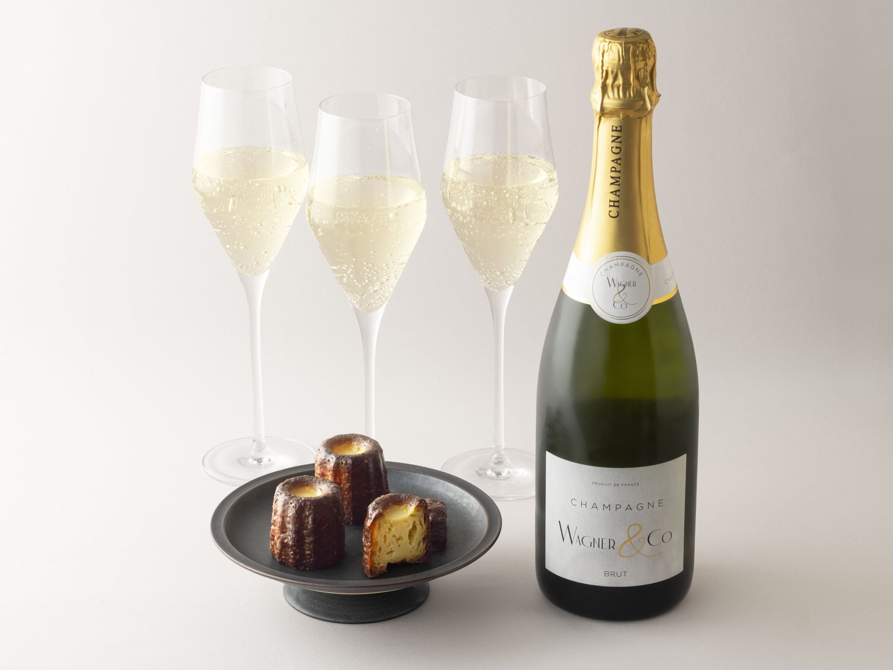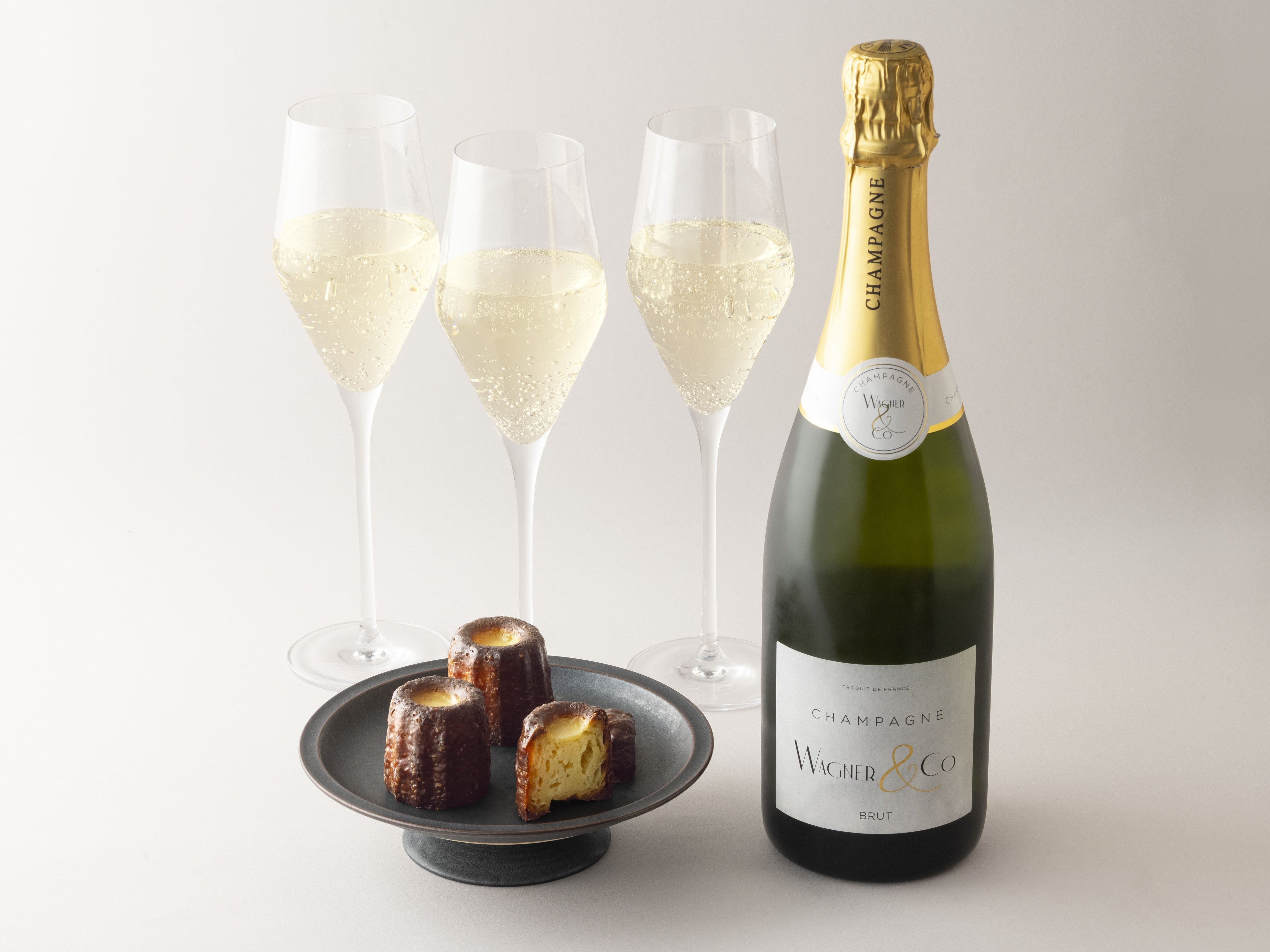 シャンパーニュ「Wagner & Co Brut Tradition」のワインボトルをご注文のお客さまに当店で大人気のコリドーカヌレを人数分セットでご提供いたします。シャンパーニュの豊かな香りと、外は香ばしく中はしっとりとしたカヌレ、この組み合わせが、年末のテーブルを華やかに彩ります。仲間や大切な人との語らいに、華を添える乾杯を。