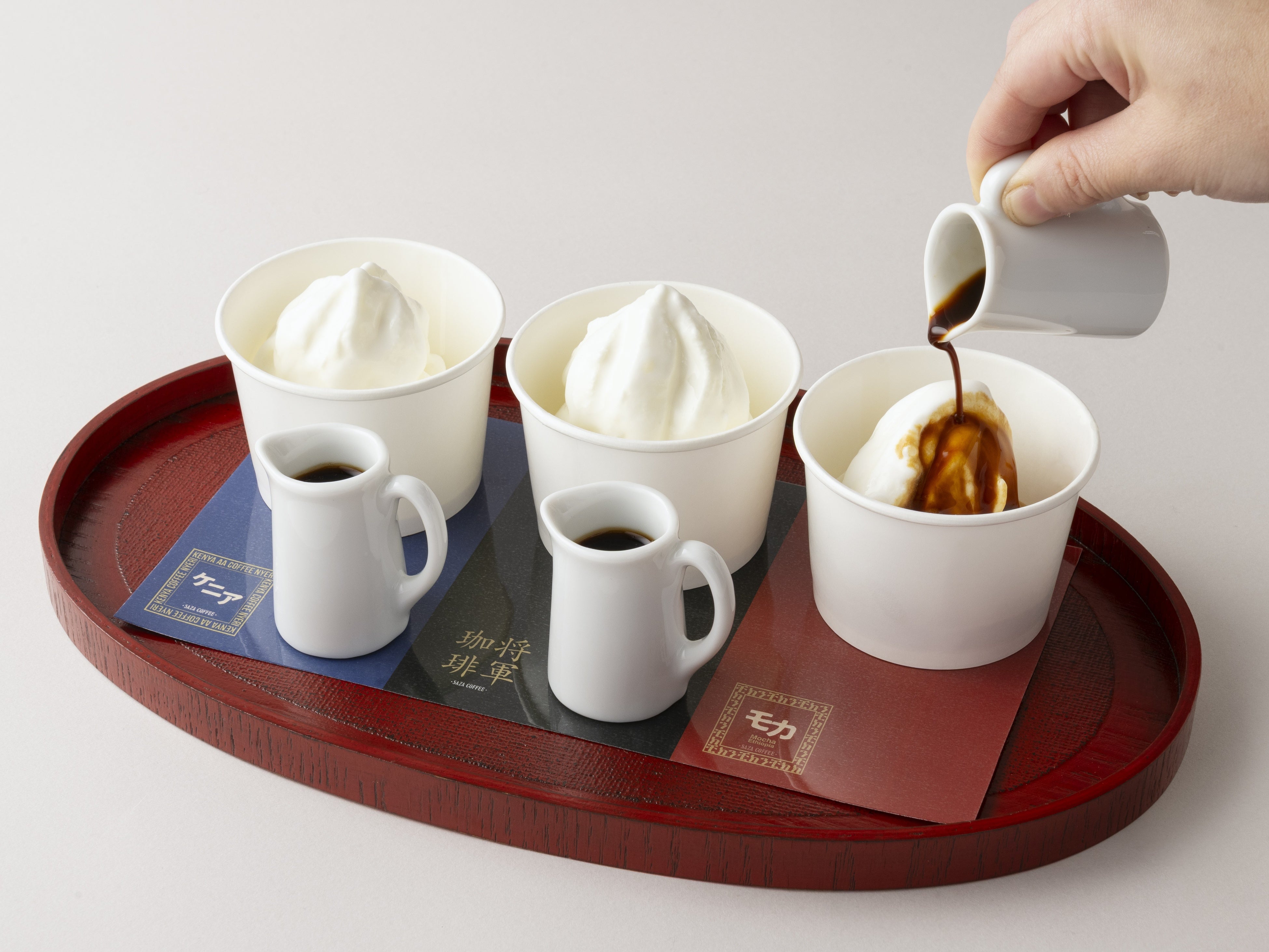 サザコーヒーが厳選する3種のコーヒーを堪能できる贅沢なアフォガードセット。深煎りの将軍珈琲、華やかな甘みのモカ、爽やかなシトラス香るケニア。個性豊かな3種のコーヒーを濃厚なミルクアイスとともに味わう贅沢なアフォガードの食べ比べセットです。香りとほろ苦さと甘みの余韻をお楽しみください。