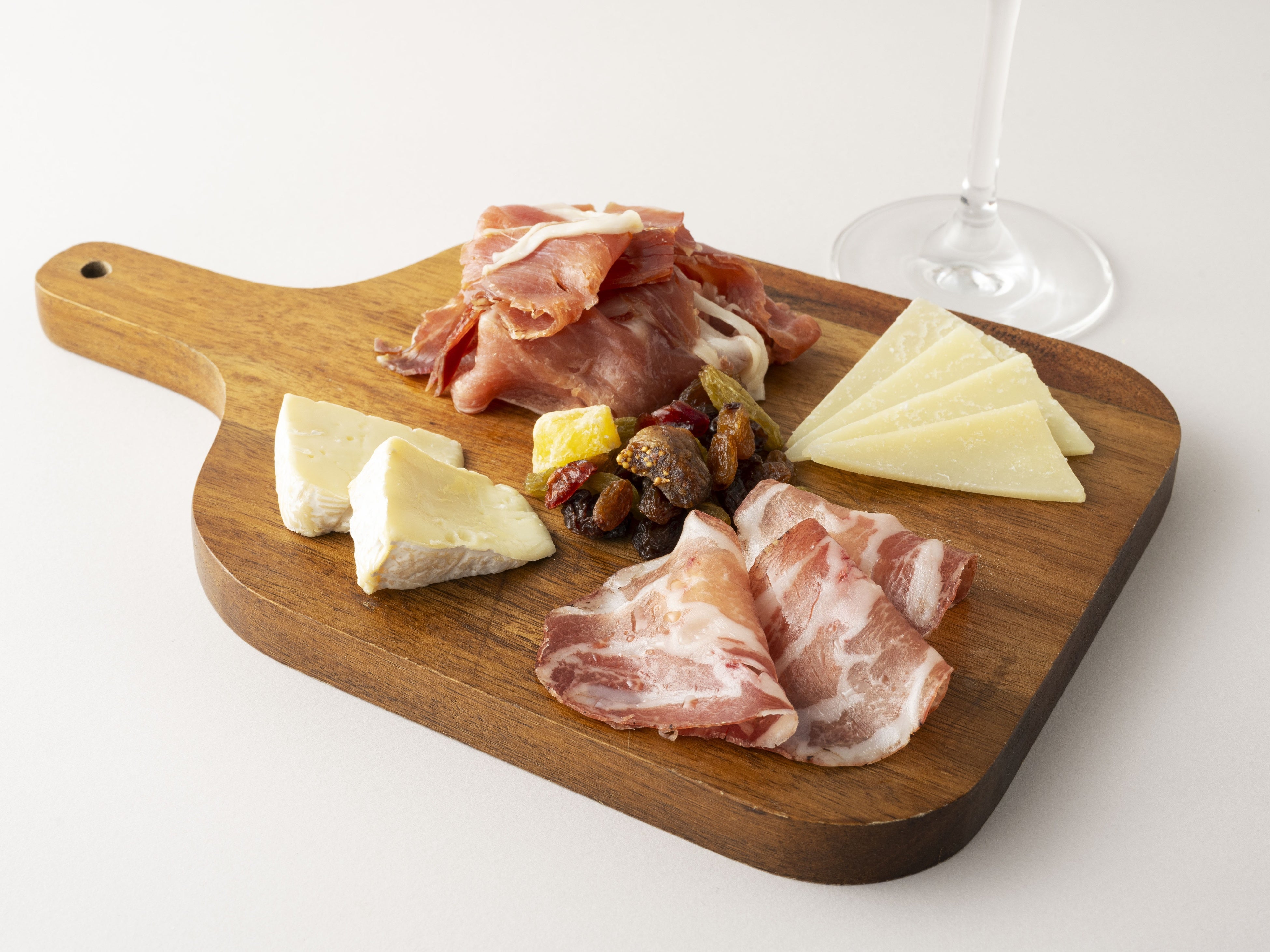 厳選した生ハムと、風味豊かな2種類のチーズを贅沢に盛り合わせました。なめらかな口どけのチーズと、程よい塩味の生ハムは相性抜群。ドライフルーツを添えて、店内30種類のワインが飲み比べ放題で、自由なペアリングをご体験ください。