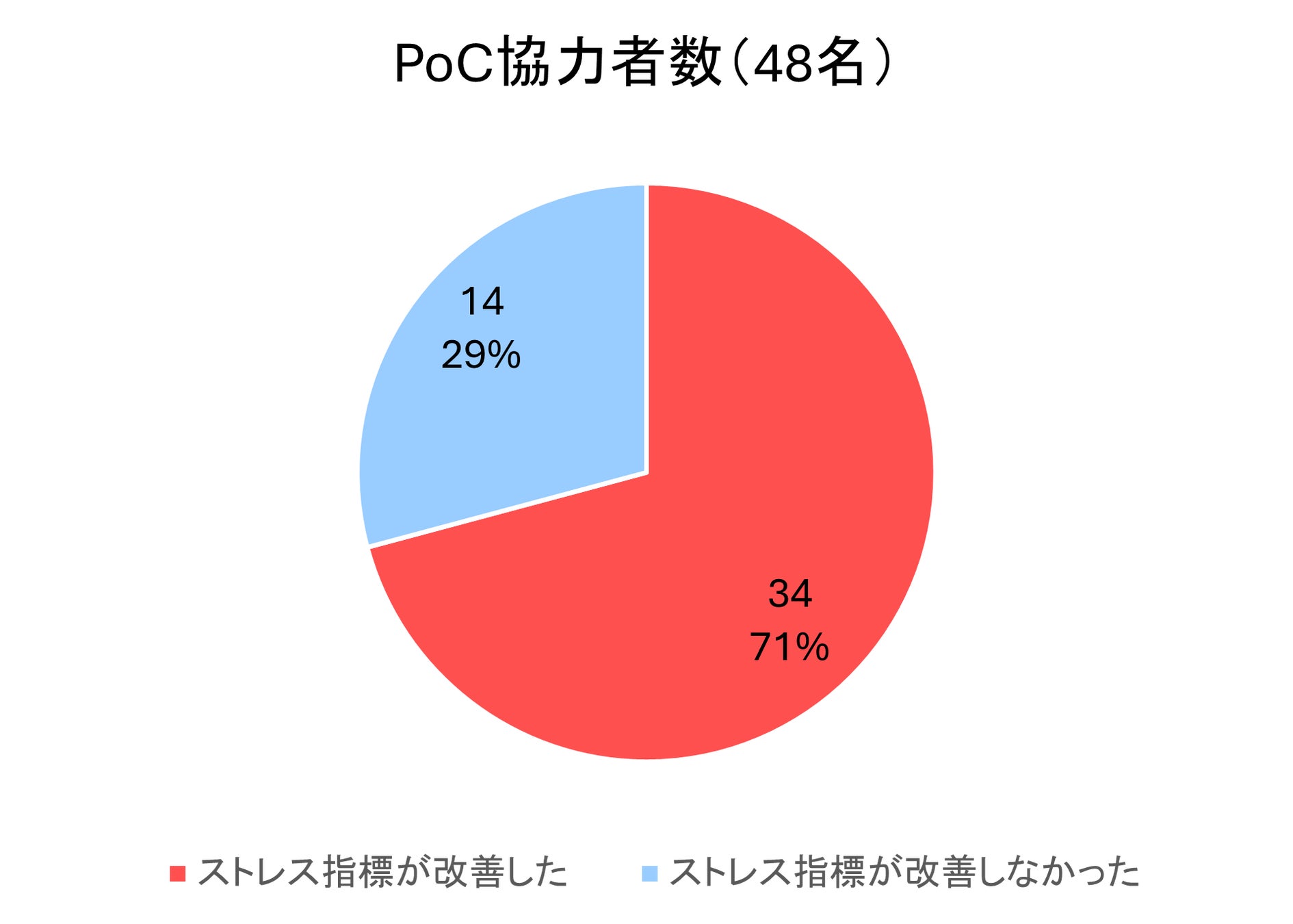 ストレス解析技術を用いて「umaru」体験前後でのストレス指標を計測し、ストレスの改善が認められたかどうかを検証しました。また、参加者に対してストレス解析と同時にアンケートを実施し、参加者本人のストレス自覚とストレス解析技術を用いた指標との比較も実施しています。