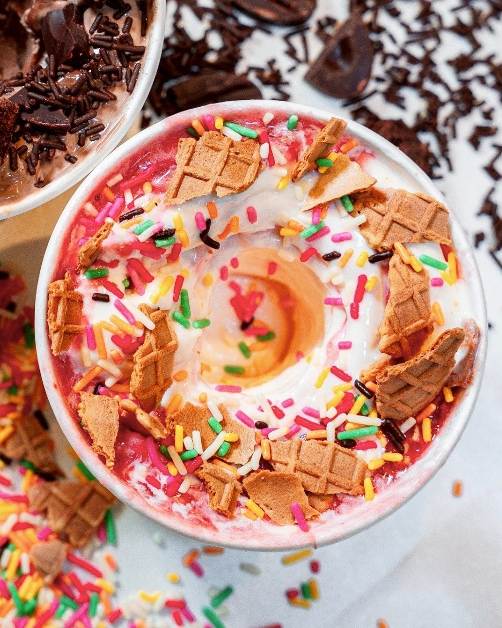 内容:なめらかな口どけのバニラフローズンカスタードをベースに、ジューシーで甘酸っぱい香りのストロベリーピューレ、サクサク食感のワッフルコーンクランブル、見た目にも楽しい華やかなレインボースプリンクルをトッピングしています。食後のスイーツや、ティータイムのお供にお楽しみください。