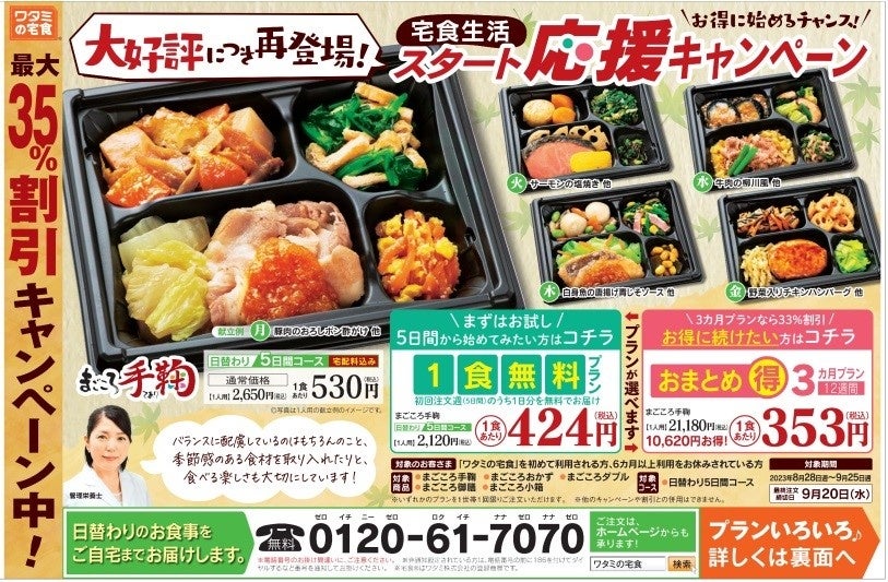 ~5,000軒突破!宅食生活スタート応援キャンペーン~※日替わり5日間コースの場合1食あたり530円のところ、おまとめ🉐3カ月プランの場合1食あたり353円(価格はいずれも税込)