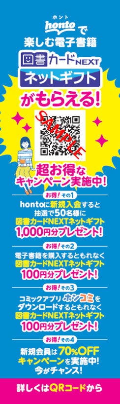 宮脇書店157店、明林堂書店54店、合計211店の店頭にて、ポスターの掲載と栞(しおり)の配布を行い、hontoへの入会、または電子書籍を購入いただくことで、hontoでも宮脇書店でも利用可能な「図書カードNEXTネットギフト」を抽選でプレゼントし、相互送客を進めます。