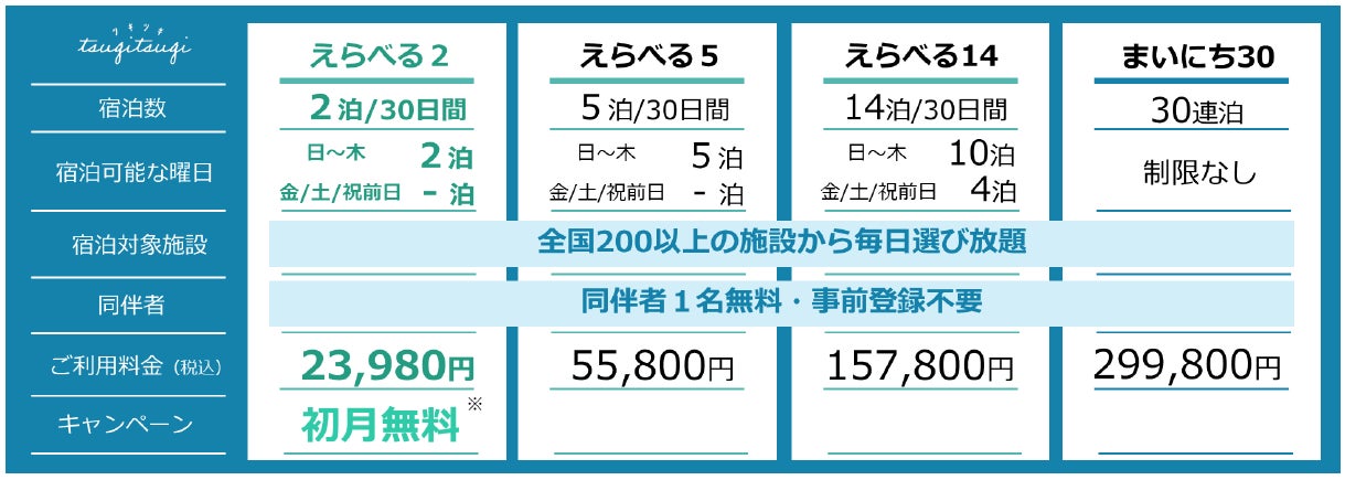 “えらべる2”・“えらべる5”・“えらべる14”・“まいにち30”の計4プランを販売しています。また、「“えらべる2”初月無料キャンペーン」を実施中です。「TsugiTsugi」は全プランで同伴者様1名まで無料でご利用いただくことができ、利用除外日はございません。各プランの詳細はサービスサイトよりご確認ください。(https://tsugitsugi.com/)