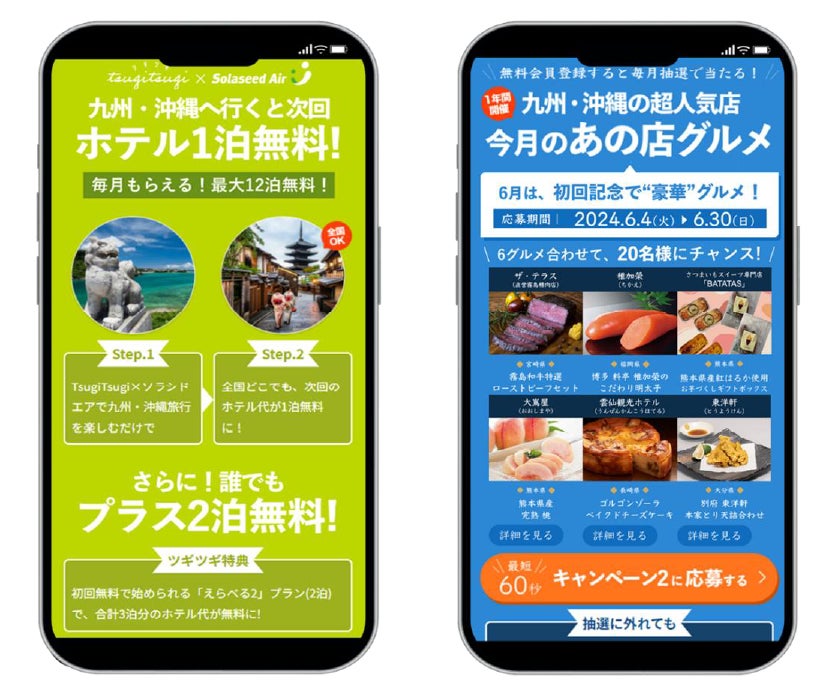 今般開始する本プロジェクトでは、2024年6月4日(火)から2025年5月31日(土)までの期間にソラシドエア便を利用して九州・沖縄エリアを訪れ、「TsugiTsugi」を利用して対象施設に宿泊いただいた全ユーザーに、全国の対象施設で利用可能な1泊分の無料宿泊権を最大で12泊分※2プレゼントします。これにより、九州・沖縄エリアへの移動を促進し、さらにソラシドエア機内、スターフライヤー機内限定価格で販売するJR九州の「JR九州フリーきっぷ」と、「TsugiTsugi」ユーザーへ優待価格でニッポンレンタカーのサービスを提供することで、より気軽な域内移動を可能とし、地域経済の活性化に取り組みます。加えて、「TsugiTsugi」の無料会員※3を対象に、九州・沖縄エリアに実在する「行ってみたくなる」“あの”名店の逸品グルメが毎月当たるプレゼントキャンペーン※4を同時に実施し、九州・沖縄エリアへの旅のきっかけづくりを行います。