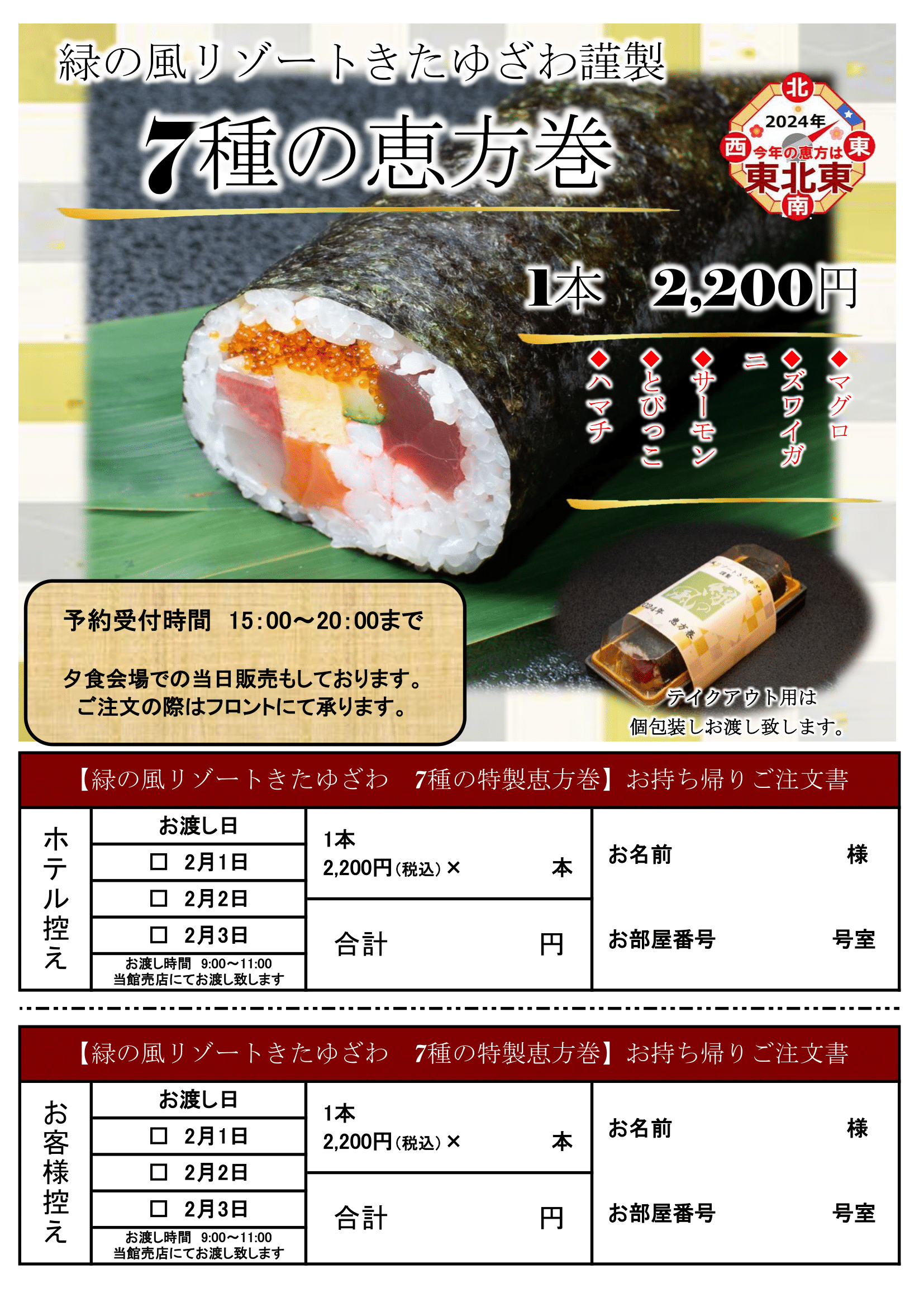 北海道伊達市大滝区北湯沢温泉にある、「緑の風リゾート きたゆざわ」では、節分に向けて、7種の具材を使った恵方巻を販売いたします!