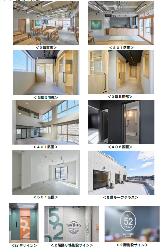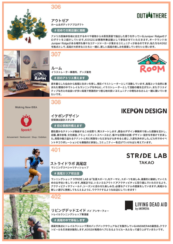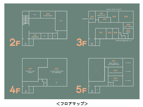 本施設は、2階から5階をリノベーションし、2階は本施設のレセプションを兼ねる高尾ビール株式会社(本社:東京都八王子市、代表取締役:池田 周平、以下「高尾ビール」)によるマイクロブリュワリー兼タップルームとコーヒースタンドからなるフロア、3階と5階は 高尾エリアで開業したい、個商いをされる方や事務所等で利用可能な、様々な業種の方が集う フロア、4階はアウトドアや登山、トレイルランニング等のブランド2店舗からなるフロアとし、グランドオープン時点で14店舗の出店が決定しました。